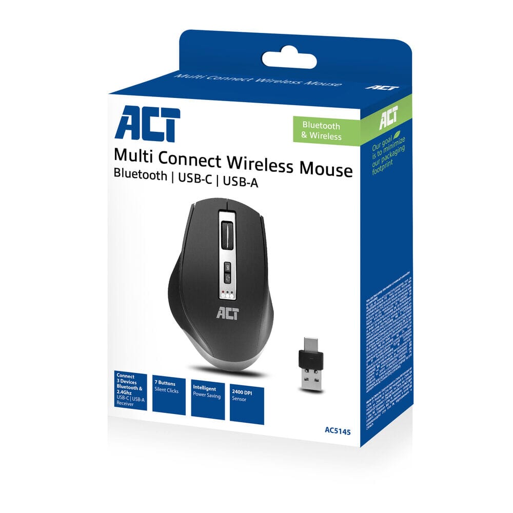 ACT Draadloze Multi-Connect Bluetooth Muis, 600 tot 2400 DPI, zwart