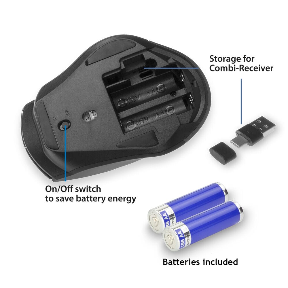 - 2-in-1 receiver met USB-C en USB-A connector; makkelijk op te bergen in de muis